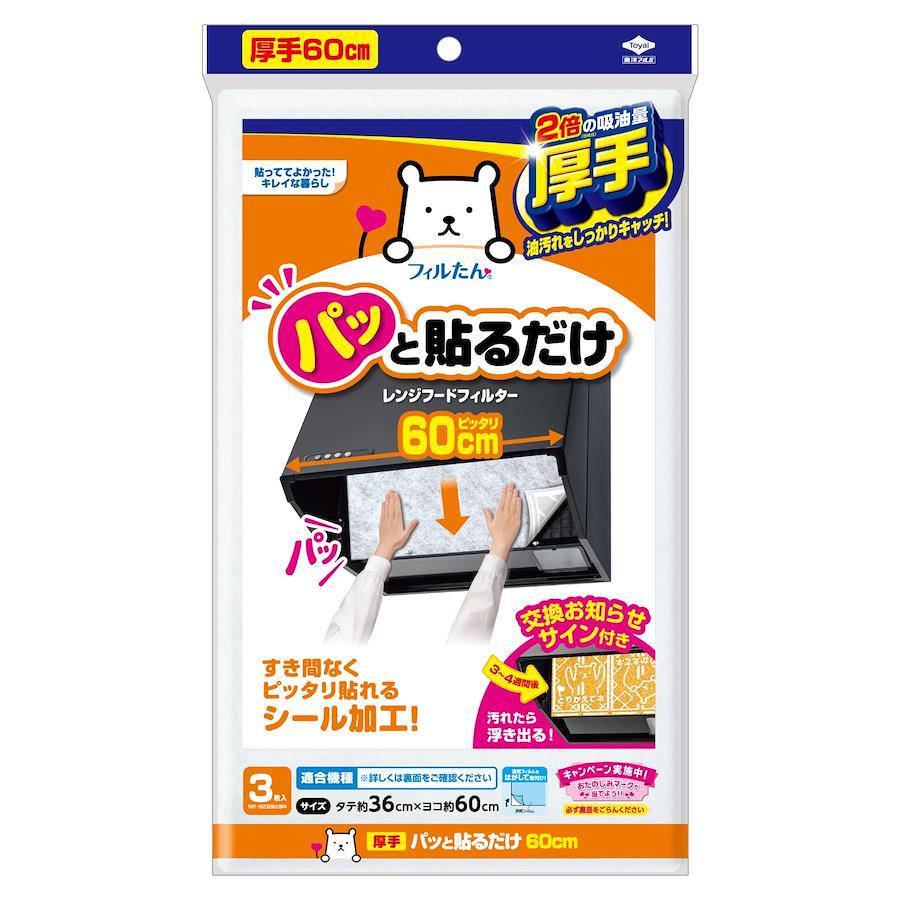 商品の説明 [東洋アルミ パッと貼るだけ 厚手スーパー深型用フィルター 60cm 3枚入り]は、レンジフードの汚れを防止します 粘着タイプで、シールみたいに簡単取り付け出来る厚手の換気扇フィルターです。 60cm幅の深型レンジフードにぴったり 入数:3枚入 商品本体サイズ:約36×60cm 本体重量:約20g 材質:難燃性不織布 原産国:日本