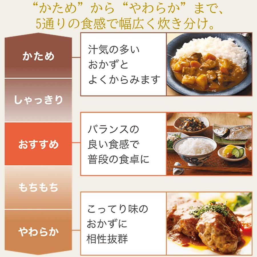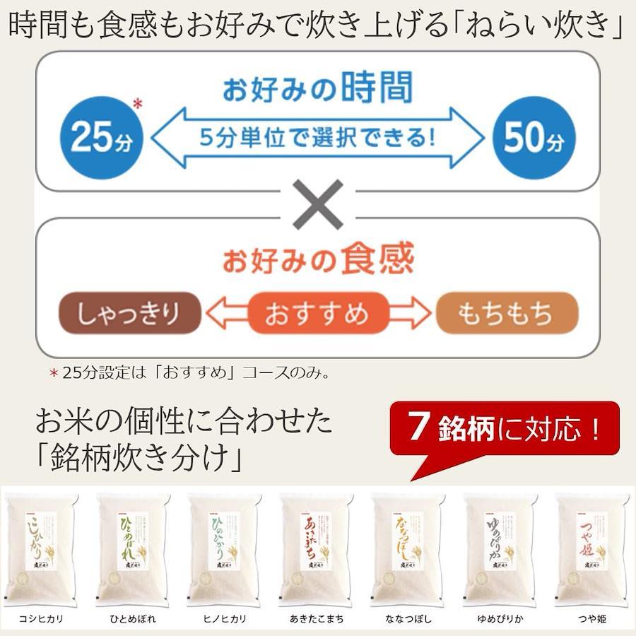 【炊き分け】お好みの食感で炊き分け5通り+銘柄炊き分け7銘柄 本かまどコースにより、5通りのお好みの食感に合わせた、かまど炊きのおいしさを選べる。 また、7銘柄の各銘柄米(コシヒカリ・ひとめぼれ・ヒノヒカリ・あきたこまち・ななつぼし・ゆめぴりか・つや姫)の特徴を生かしておいしく炊き分ける銘柄炊き分けコースを搭載。