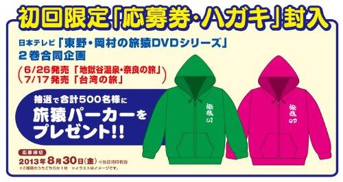 東野と岡村に加え、出川も同行することに。 旅の目的は「岡村と出川の雌雄を決する旅」! 「ハワイの旅」の中でも所々でケンカしていた2人。 それを見ていた東野が台湾を旅しながら様々な場所で対決を行ってもらおうと画策。 羽田空港で集合した2人はいきなりいがみ合う。 波乱の予感満載の台湾の旅。 (1)未公開! 空港で大ハシャギ! (2)未公開! 占い結果に岡村が不満爆発! (3)未公開! 高級スパでお尻丸出し! 【未公開! スペシャル特典映像】 東野&岡村vs 出川 ベッド争奪戦 完全版! 【初回限定封入】 ・6/26 発売「地獄谷温泉+奈良の旅」 ・7/17 発売「台湾の旅」 日本テレビ「東野・岡村の旅猿DVDシリーズ」2 巻合同企画 応募抽選で合計500名様に“旅猿パーカー"をプレゼント!! ※2 種類のうちいずれか1 枚 応募締切:2013年8月30日(金)※当日消印有効 (C)2013 日本テレビ