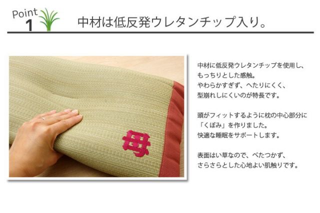 国産のイ草を使用したイ草枕です。より頭にフィットするよう、枕の中心部分に「くぼみ」をつくりました。快眠い草の効能として1.綿の約2.5倍の吸湿力2.蒸れにくい。汗による湿気を吸うことにより温度を下げ快適な就寝を促します。3.汗のにおいを軽減。汗のにおいの元となる化学物質を90%以上抑えます。などがあります。国産(九州産)のしなやかなイ草を使用していますので、柔らかく、すべすべしたとした肌触りです。中材には低反発ウレタンチップを使用しています。柔らかすぎずヘタリにくく、型崩れしにくいのが特長です。い草の表面に天然青森ヒバ加工を施しています(抗菌・防臭効果)。青森県のヒバの木から抽出した「ヒバ油」をメーカー独自の技術で材料や商品に加工しました。「ヒバ油」には、ヒノキチオールという天然物質としては極めて抗菌性の高い成分が含まれ、医療や食品など多分野で利用研究が進められています。