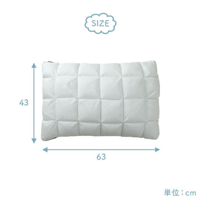 "ふわふわでおもわずほおずりしたくなるような雲をイメージした枕です。側生地は立体キルト構造でもこもこを表現、更に中わたには極細繊維を使用しているため軽くてふわふわしており、まるで雲に包まれているかのようなここち良さでリラックスできます。伸縮性のある専用カバー付き、もこもこ感を損なわないように柔らかく、フィット性のあるカバーにしております。枕本体もカバーも洗濯機で洗えますので汚れやすい枕もより清潔にご使用いただけます。