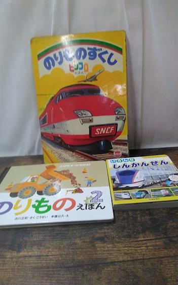 中古品です。「のりものえほん2」ページが外れています。テープ補修してあります。表紙に汚れ、キズ、色あせ、シミ、スレ、折れがあります。中身に汚れ、キズ、色あせがあります。栄光社、偕成社、交通新聞社ののりもの本、「のりものずくし、のりものえほん2、いろんなしんかんせん」です。