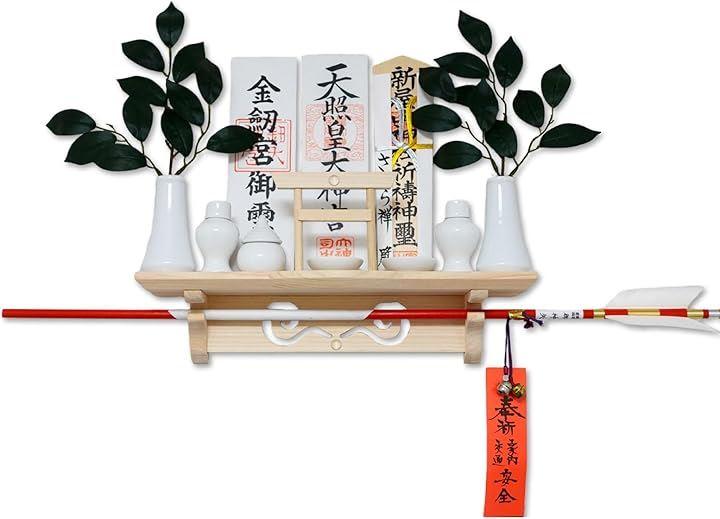 「*御札・神具一式・破魔矢は別売で付属はございません」鳥居の差込み穴は鳥居を抜けづらくする為に少しづらして設計されておりますので、鳥居を差し込む時は鳥居の足部分を軽く握り、穴に合わせ、はめ込むようにして取付けて下さい。