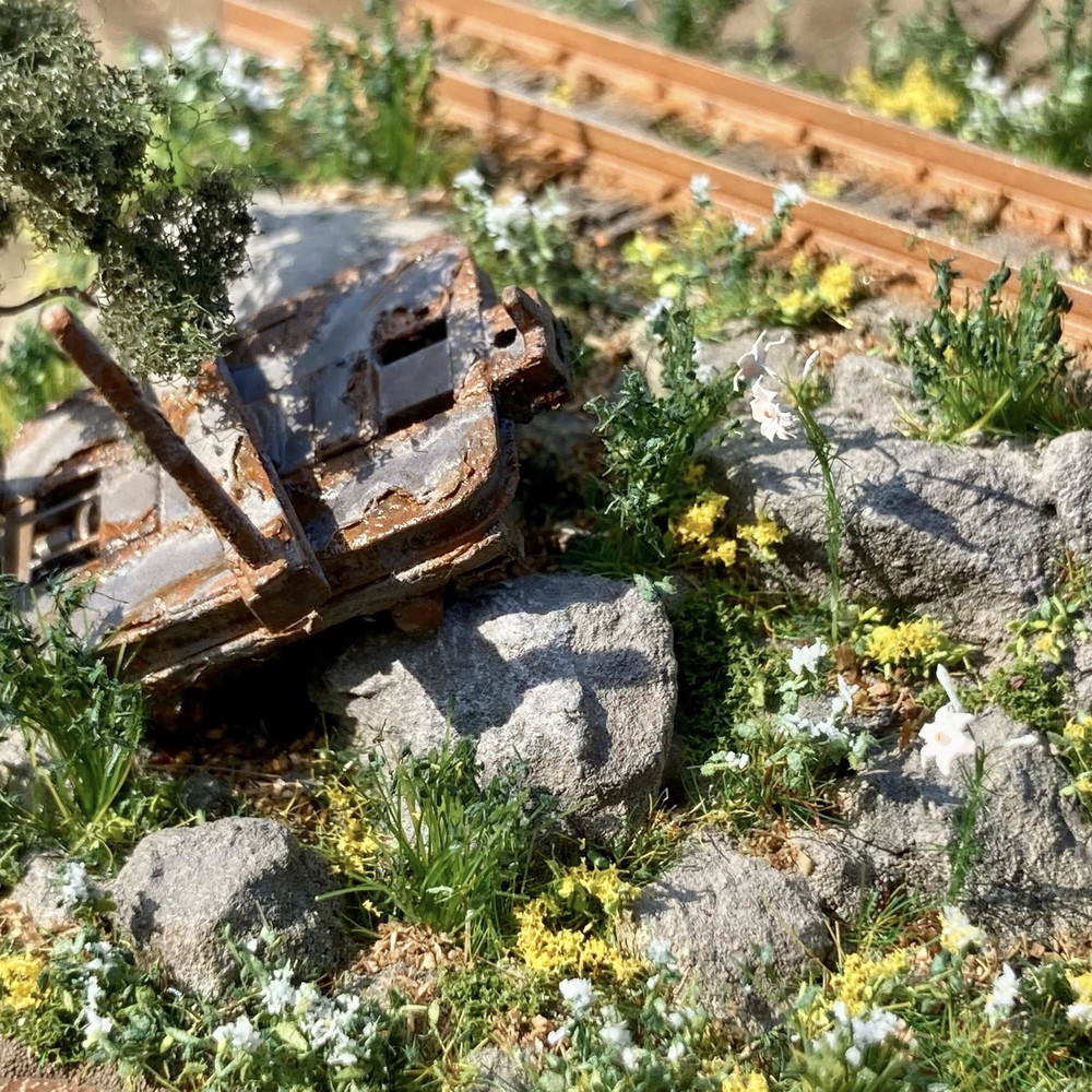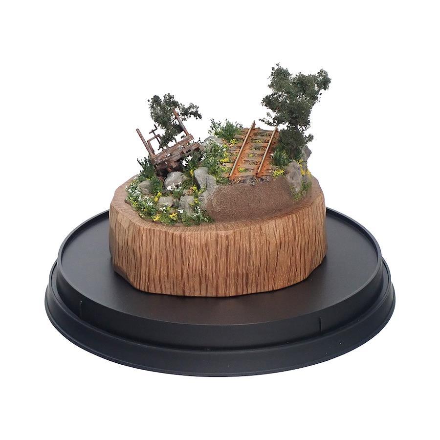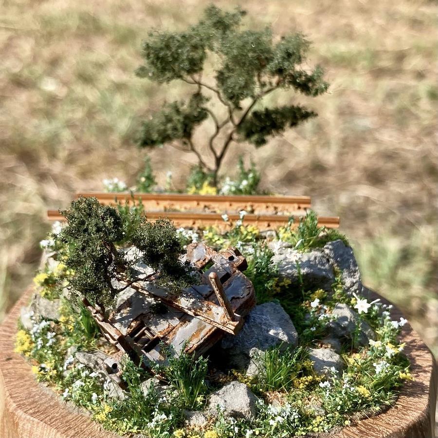 tiny, lilies built to the limit, the texture of the sleepers and rails, and the rust of the operating carriages. The composition is worth seeing from 360 degrees even in the palm of your hand.