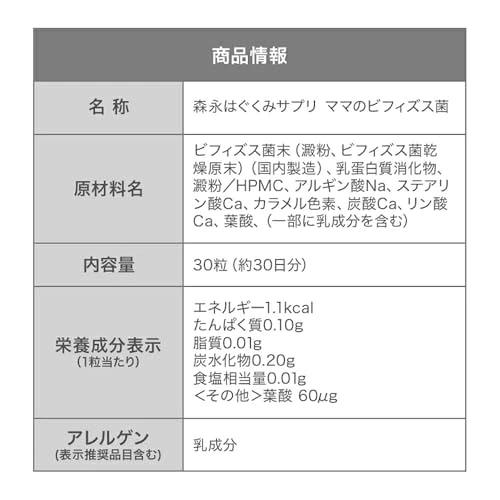 ビフィズス菌末 澱粉、ビフィズス菌乾燥原末 国内製造 、乳蛋白質消化物、澱粉 HPMC、アルギン酸Na、ステアリン酸Ca、カラメル色素、炭酸Ca、リン酸Ca、葉酸、 一部に乳成分を含む ブランド紹介