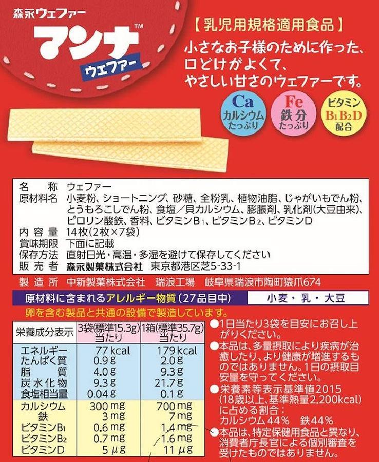 小麦粉、ショートニング、砂糖、全粉乳、植物油脂、じゃがいもでん粉、とうもろこしでん粉、食塩、貝カルシウム、膨脹剤、乳化剤(大豆由来)、ピロリン酸鉄、香料、ビタミンB1、ビタミンB2、ビタミンD