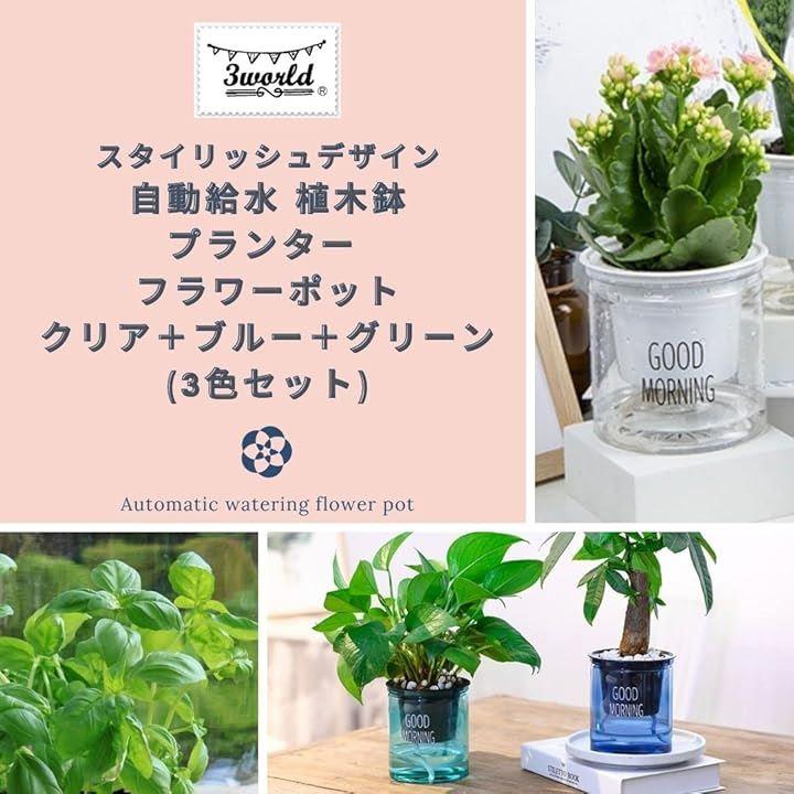 3world 植木鉢 スタイリッシュデザイン 自動給水 プランター フラワー ポット クリア+ブルー+グリーン(3色セット) 「セット内容」透明カバー+鉢+綿ロープ 各3個セット 「材質」カバー・鉢:PET 、ロープ:綿 ・シンプルでオシャレなフラワーポット。・自宅で過ごす時間も増えたこの機会に、新しく緑ある生活をはじめてみませんか?・多肉植物や観葉植物はもちろん、ハーブやお花なども手軽に栽培でき、プラスチック製なので割れにくく持ち運びに便利です。