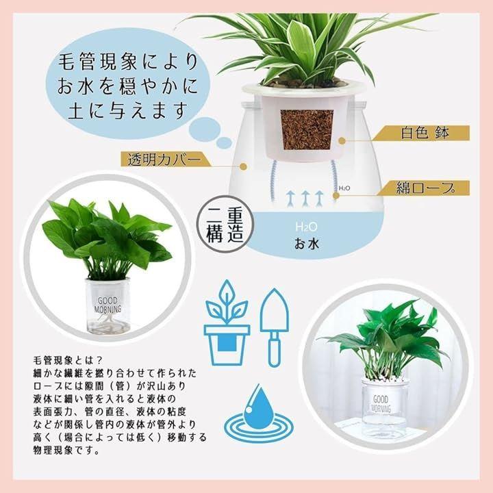 大人気のフラワーポットの3色セット。可愛い透明カバーお水の量が一目瞭然。「特徴」ポットは二重構造で外側の透明カバー部にお水を張り、内蔵されているロープの毛管現象により水を吸い上げ内側の鉢内部の土に自動的に水分を与えます。