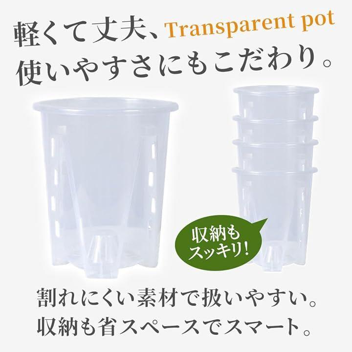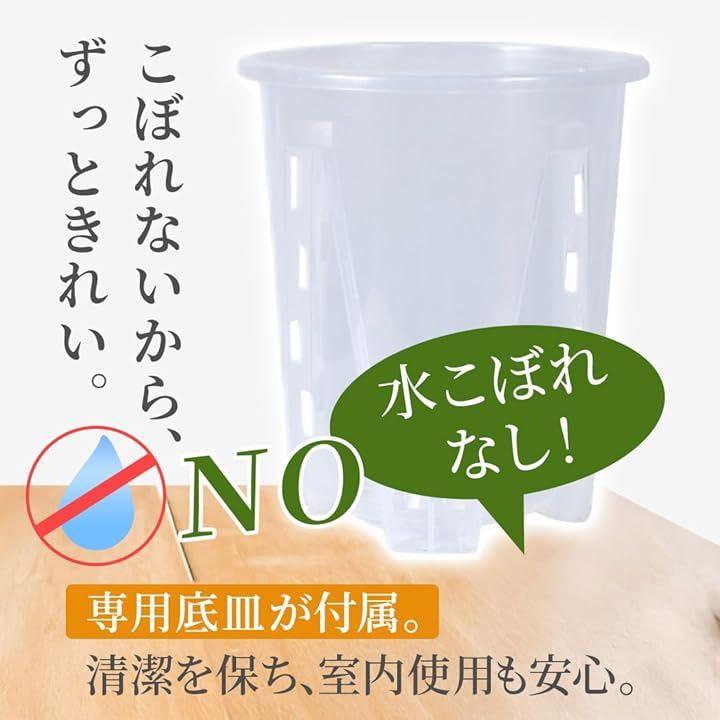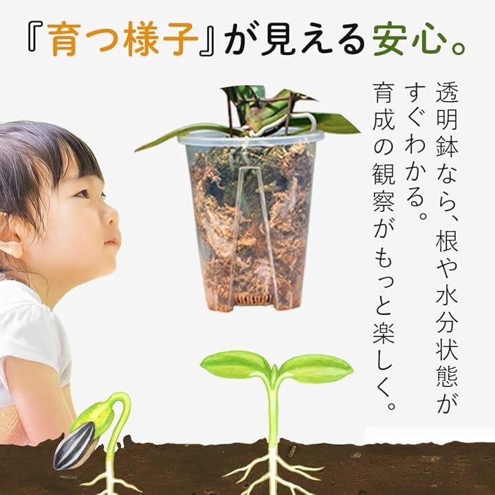 「透明素材で根の成長が見える」高透明プラスチックを使用しており、植物の根の様子や水分量を外から確認できます。