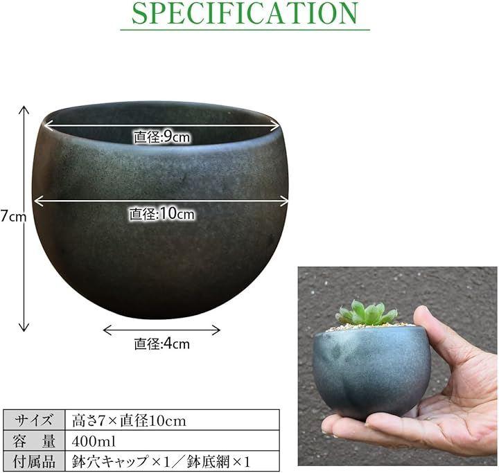 「サイズ」高さ7x最大直径10cm「素材」磁器「容量」400ml「付属品」鉢穴キャップx1、鉢底網x1「生産国」日本 Made in japan