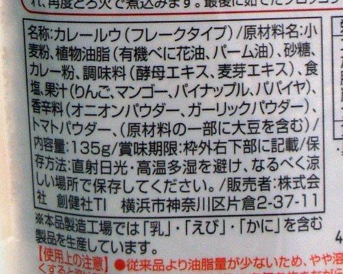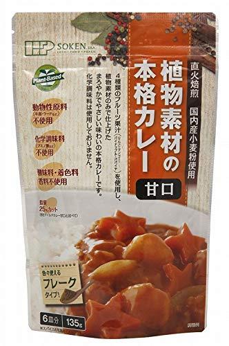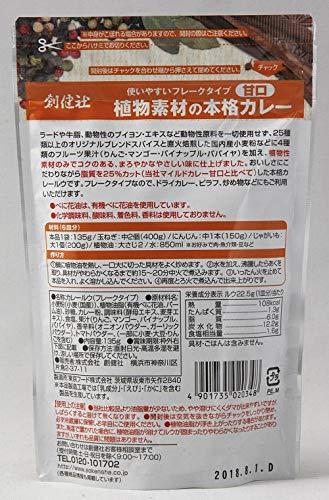 ラードや牛脂、動物性のブイヨン・エキスなど動物性原料は一切使用していません。おいしさにこだわりながら脂質を25%カット(当社マイルドカレー甘口と比べて)しました。25種類以上のオリジナルブレンドスパイス、直火焙煎した国内産小麦粉、有機べに花油など植物性素材のみで仕上げた本格カレールウです。4種類のフルーツ果汁(りんご、マンゴー、パパイヤ、パイナップル)を加え、どなたでも食べやすい、まろやかなやさしい味に仕上げました。1袋6皿分です。