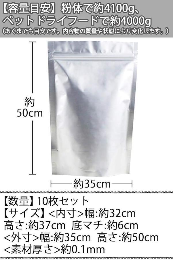 「数量」10枚セット 「サイズ」<内寸>幅 約32cm 高さ 約37cm 底マチ 約6cm <外寸>幅 約35cm 高さ 約50cm <素材厚さ> 約0.1mm 「容量目安」粉体で約4100グラム、ペットドライフードで約4000グラム(あくまでも目安です。