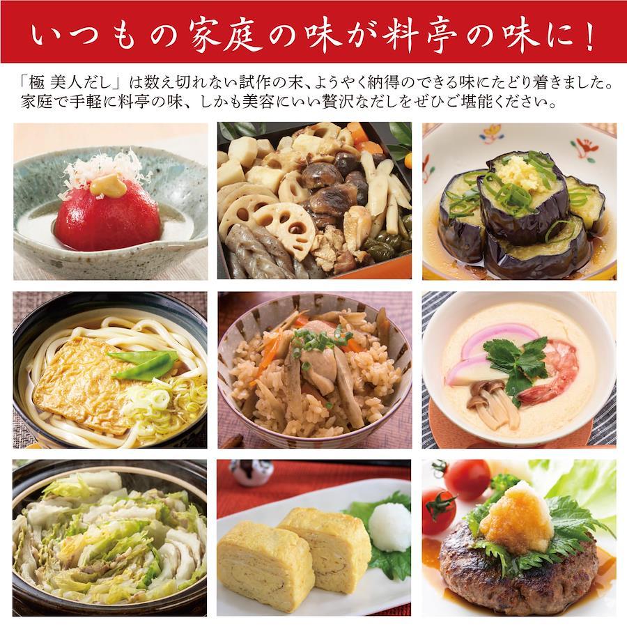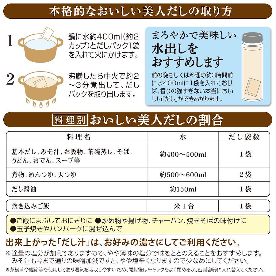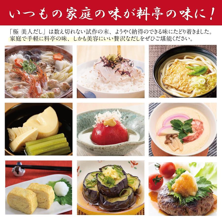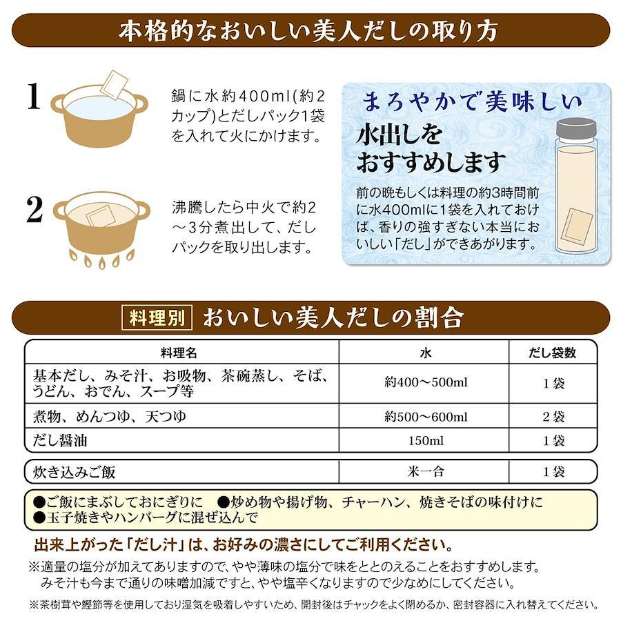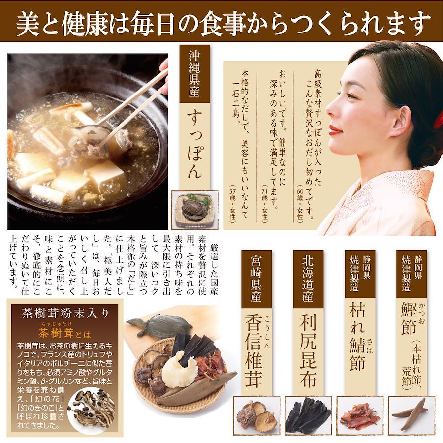 3営業日以内に発送≪新品未開封品≫【いつもの家庭の味を料亭の味に】基本のだしはもちろん、みそ汁、お吸い物、茶わん蒸し、おでんなど、いつもの家庭の味を料亭の味に1ランクアップ。【厳選した国産素材をふんだんに使用】とらふぐ(山口)/すっぽん(沖縄)/かつお節(焼津)/さば節(焼津)/利尻昆布(北海道)/香信椎茸(宮崎)【水だしがおすすめ】前の晩もしくは料理の約3時間前に水400mlに1袋(6.5g)を入れておけば美味しいだしができます。お料理の時短にもご協力できる【本格派の出汁パック】です。お手軽な家庭のキッチンの見方となります。サマーギフト、夏ギフトやお中元や敬老の日のプレゼントにも人気の商品です。飲む出汁としても好評です。【重要】メーカーによる商品リニューアルに伴いパッケージ(内容量も含む)変更が行われた場合、新パッケージでお届け致します事ご了承願います。