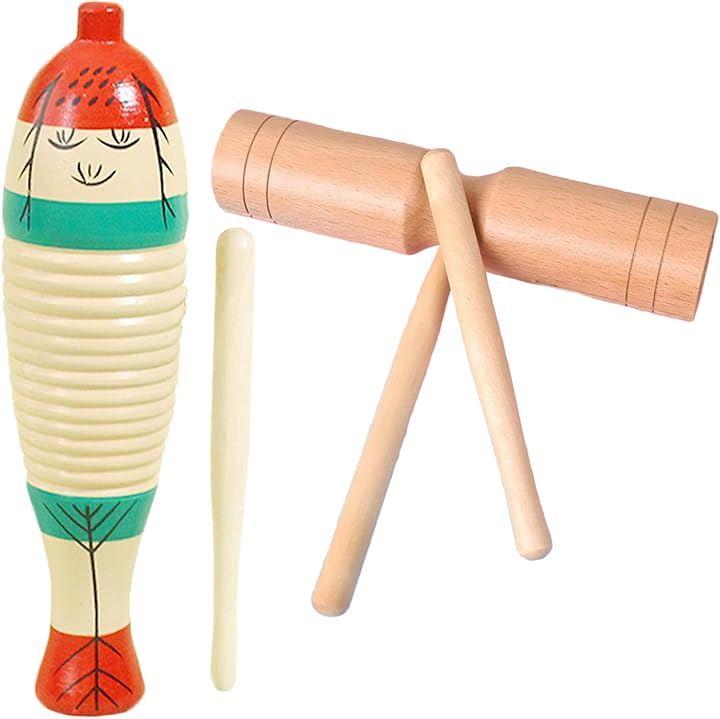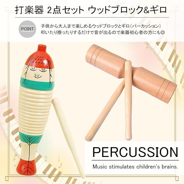 幼児教育や情操教育にもおすすめ。木製打楽器セット。 お子さまのリズム感を養う知育楽器として、カエルの鳴き声をモチーフにしたひょうたん型のギロ、さらにウッドブロックの2種類をセットにしました。