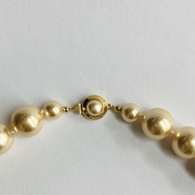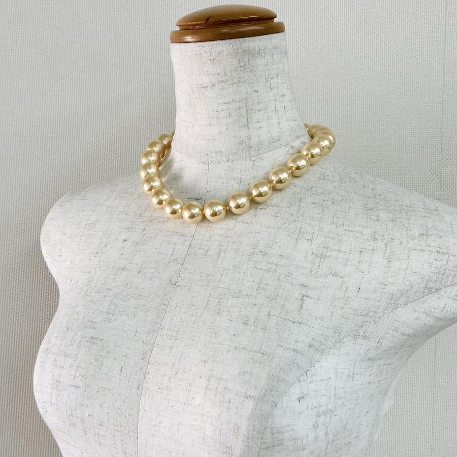 こちらは樹脂素材の原玉を使用したオリジナル日本製樹脂パールネックレスです。パールとパールの間に1つづつ結び目を入れたオールノット仕様で、ワンランク上のコスチュームジュエリーとなっております。パールサイズは大振りの直径約16mmサイズで、長さは全長約44cmと標準的なプリンセスサイズになっております。大粒ながらも樹脂素材なのでそこまで重くなく、存在感もあってお使い頂きやすいデザインになっております。