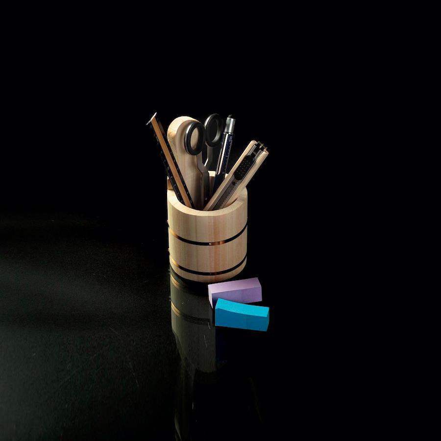 日本産ヒノキ無垢材から作ったミニサイズの手桶です。デスクのペンスタンドとして使ったり、お部屋のちょっとしたインテリアとしても映える一品です。(水を入れたり食品を入れる仕様ではありませんのでご注意ください)