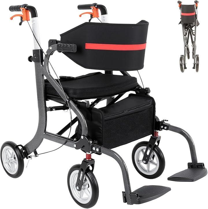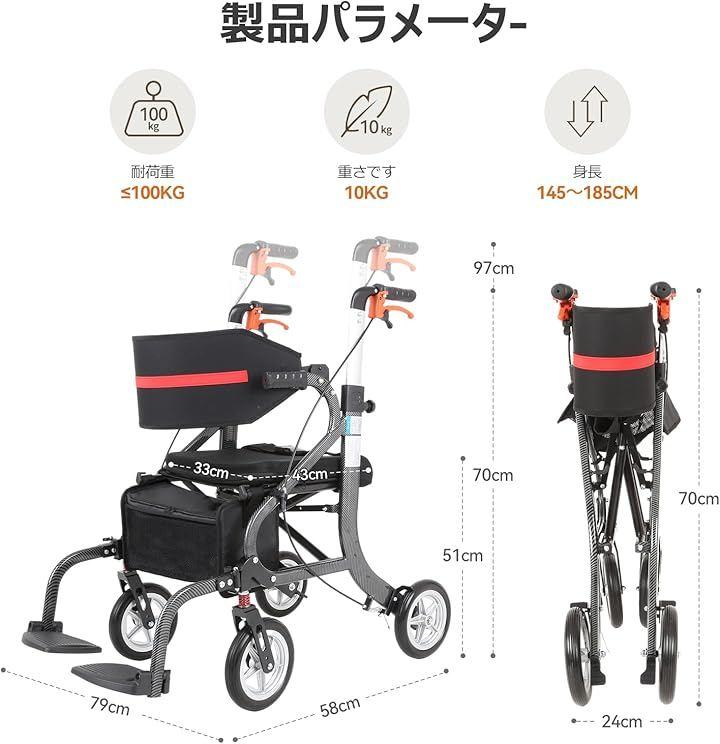 「1台3役:歩行器+ショッピングカート+簡易車椅子」歩行補助だけでなく、前方の座面に腰掛けて休憩も可能。