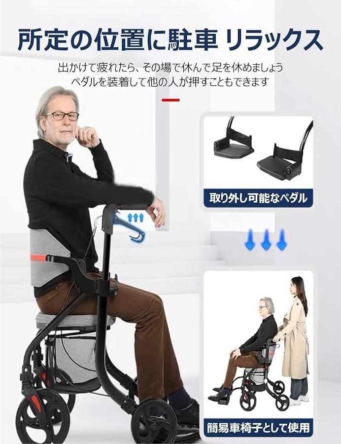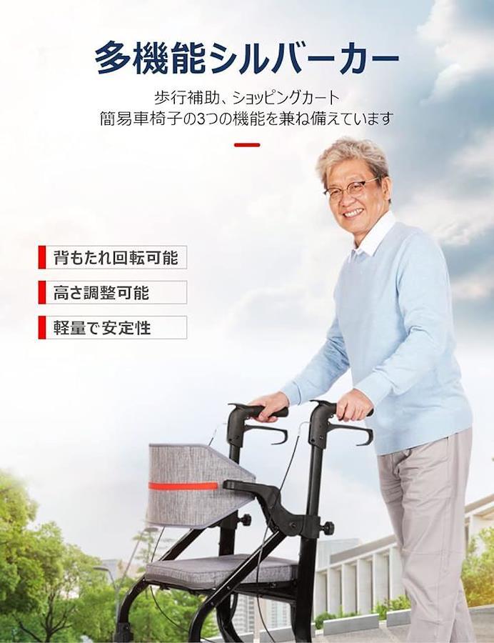 歩行補助、ショッピングカート、簡易車椅子の3つの機能を兼ね備えています。