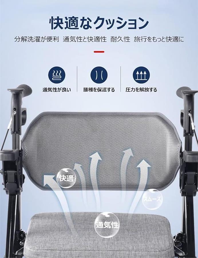 「座り心地良い」歩行器の通気性に優れたハニカム背もたれは両側回転でき、クッションは通気性のあるフリースでできており、通気性があり快適で、腰椎を保護し、旅行をより快適にします。