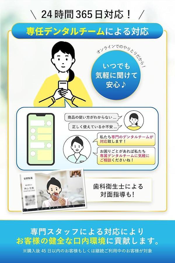 「専任デンタルチームによるサポート」安野製薬の商品には歯科医師や歯科衛生士を中心とした専任チームによるサポートがついております。