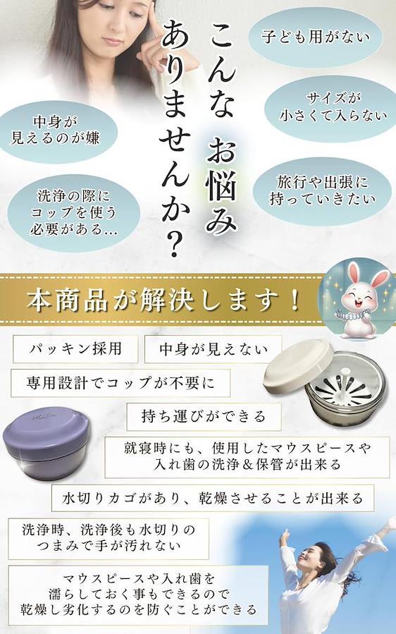 矯正、審美、スポーツ、いびき、ナイトガードなど各種マウスピースや部分入れ歯などに活用できます 特長としてはしっかり洗える事です それによって構内環境を清潔に保つ事ができます 他には、水切りカゴ、中身が見えない設計、パステルカラーな4色などの特長もあり 洗面所にそのまま置いておいても良くなじむ設計としています。 水量は250ml入るので洗浄剤を入れてしっかり洗うことが出来ます しっかり洗えるので口内環境を清潔に保つ事ができます 毎日使うからこそ清潔に <注意> 総入れ歯に関してはサイズ上使用不可となります ご購入に際しサイズを記載していますので予めご確認いただけますと幸いです