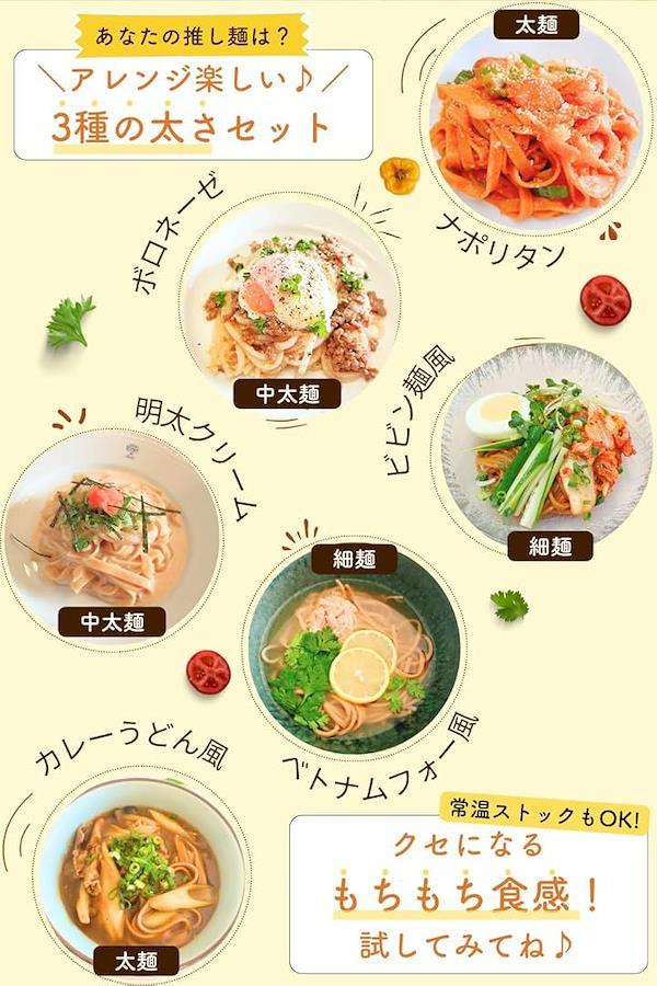 細麺・中太麺・太麺の3種入りなので、パスタやうどん、そばやラーメン、パッタイなど、さまざまなレシピでアレンジを楽しんでいただける米粉麺です。