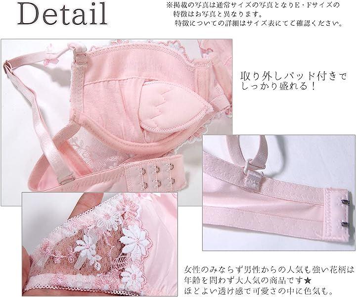 「特徴」<全サイズ共通>ストラップ取り外し可能/ストラップ調節可能/ワイヤーあり/伸縮性・透け感・通気性あり <A-Dサイズ>2x3ホック/パッドポケットあり/下厚カップ1.5cm(取り外しパッド付) <EFサイズ> 3x3ホック/パットポケットなし/取り外しパットなし/厚手カップ約1.5cm