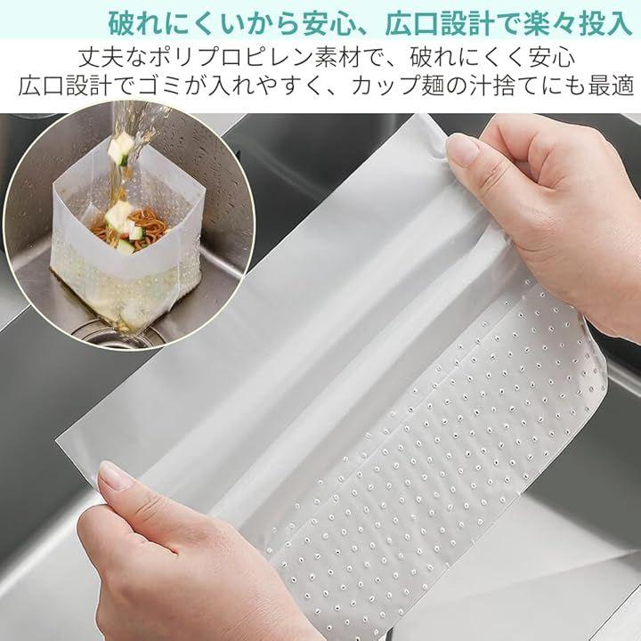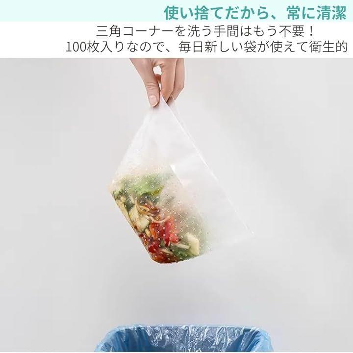 「使い捨てで清潔さをキープ」100枚セットの大容量。毎日気軽に使える使い捨て水切り袋は、日常の家事をスムーズにします。