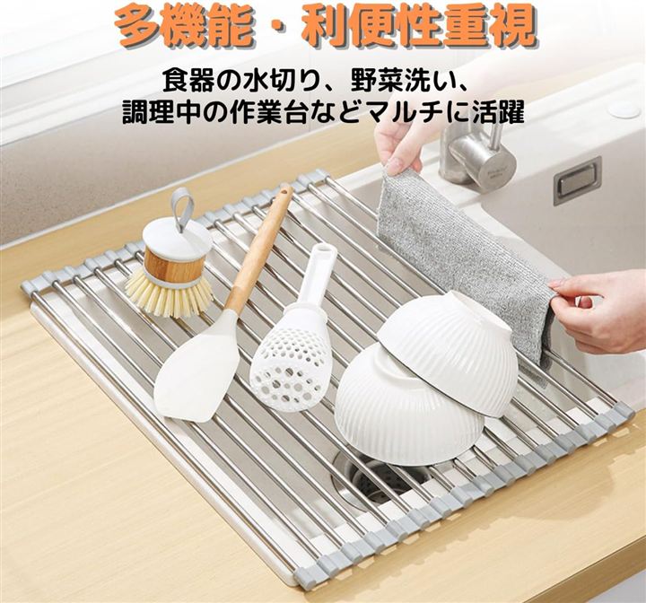 「省スペース・収納重視」くるくる丸めてキッチン広々 キッチンが狭いお悩みを解決する、くるくる丸めてコンパクトに収納可能な水切りラックです。