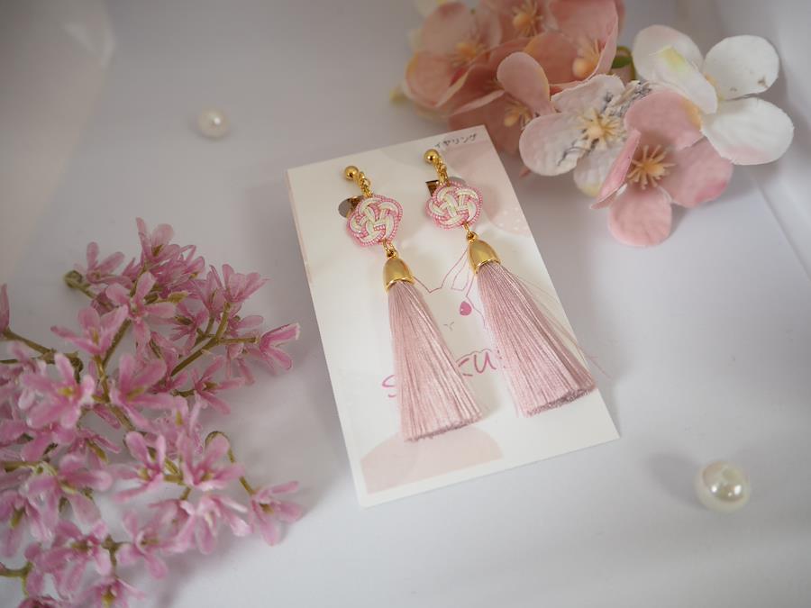シルクの糸を染料で染めてタッセルにし、ピンク系の水引とあわせましたイヤリングでございます。シンプルで上品な梅結びの存在感がある仕上がりになりました。ハンドメイドの為、一点物となります。