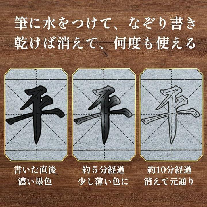 「汚れず安心」墨汁を使用する書道セットの場合、特に不慣れな場合は墨で服やテーブルが汚れてしまう事も多いですが、こちらの水書き書道セットは水だけを使用するタイプですので、汚れてしまうことは無く、練習用として使用しやすいです。