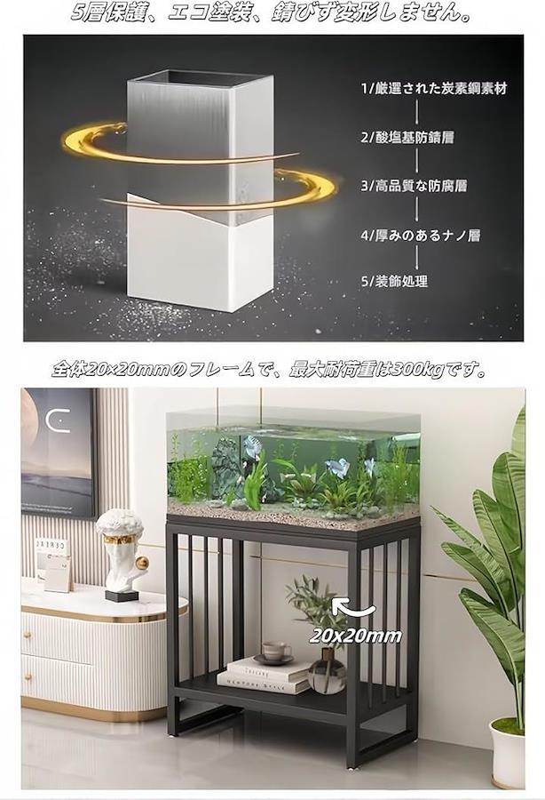 最大300kgの重量まで支えることができ、どんなに大きな水槽でも、他の重い物を置いても安定して支えます。