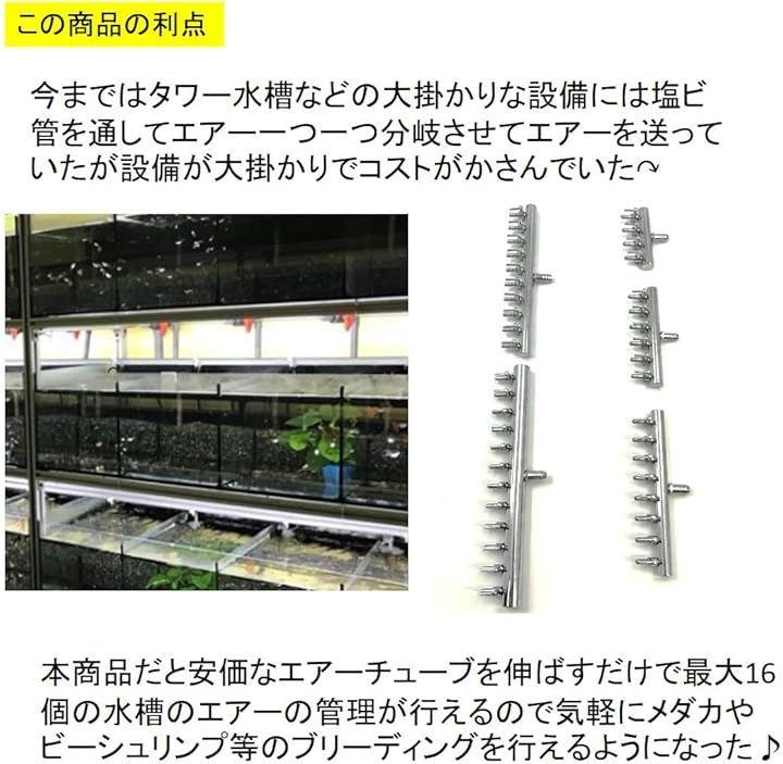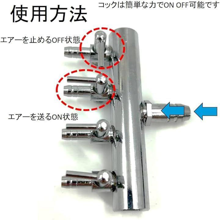 「この商品の利点」今まではタワー水槽などの大掛かりな設備には塩ビ管を通してエアー一つ一つ分岐させてエアーを送っていたが設備が大掛かりでコストがかさんでいた↷本商品だと安価なエアーチューブを伸ばすだけで4個、6個、8個、 10個、12個 の水槽のエアーの管理が行えるので気軽にメダカやビーシュリンプ等のブリーディングを行えるようになった。