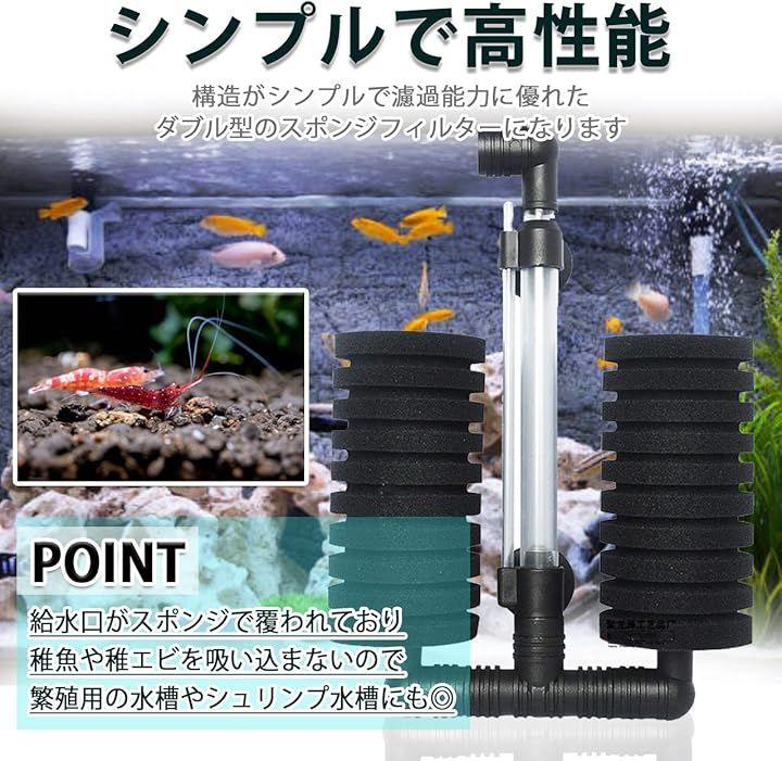 給水口がスポンジで覆われており、稚魚や稚エビを吸い込まないので、繁殖用の水槽やシュリンプ水槽にもオススメです。