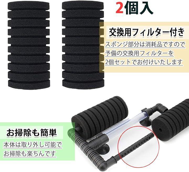 「商品内容」スポンジフィルター:1個 予備フィルター:2個 本体サイズ:16.5x23cm(高さ最大35.5cm) スポンジサイズ:直径4.8cmx高さ11.8cm ホース接続部:直径2cm 材質:生化綿+樹脂 適合水槽サイズ:約60~90cm *生産工場の都合で、仕様に少し変更がある場合がございます。