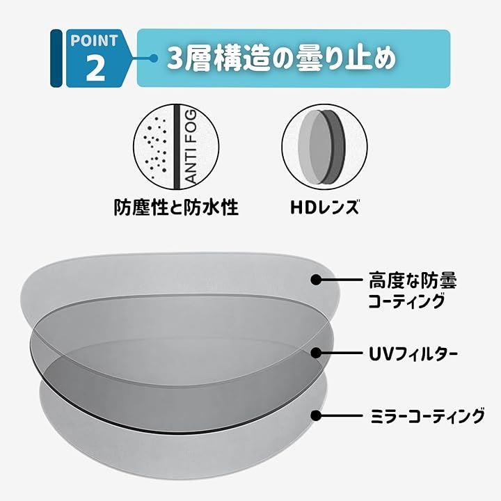 水中での視界をクリアに保つ強力な曇り止め加工が施されており、xx「安いゴーグルと違い曇り止め効果も良い」xxと高評価をいただいています。