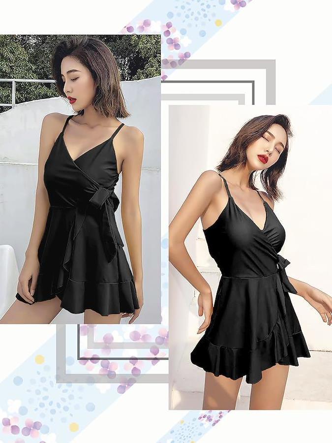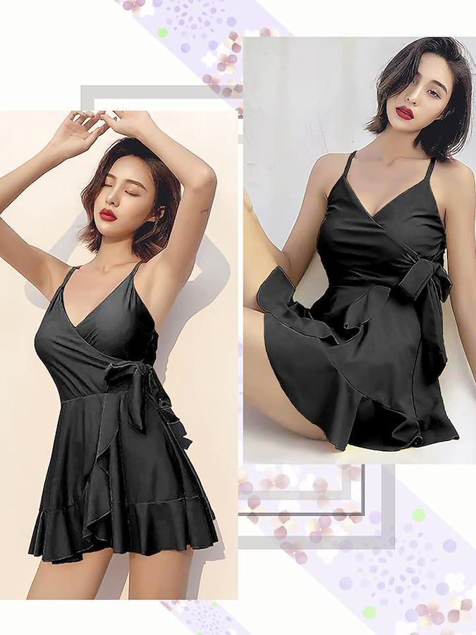 ウエストにあしらわれたリボンがエレガントで女性らしさをアピールするオールインワンのワンピース水着です。