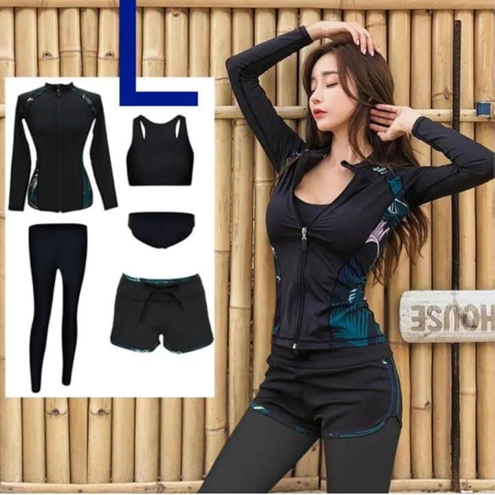 海やプールで頼れる5点セット:このラッシュガードセットは、長袖トップス・ブラトップ・ショートパンツ・レギンス・インナーパンツの5点が一式揃っており、スポーツやレジャー、海やプールでの水遊びに幅広く対応します。