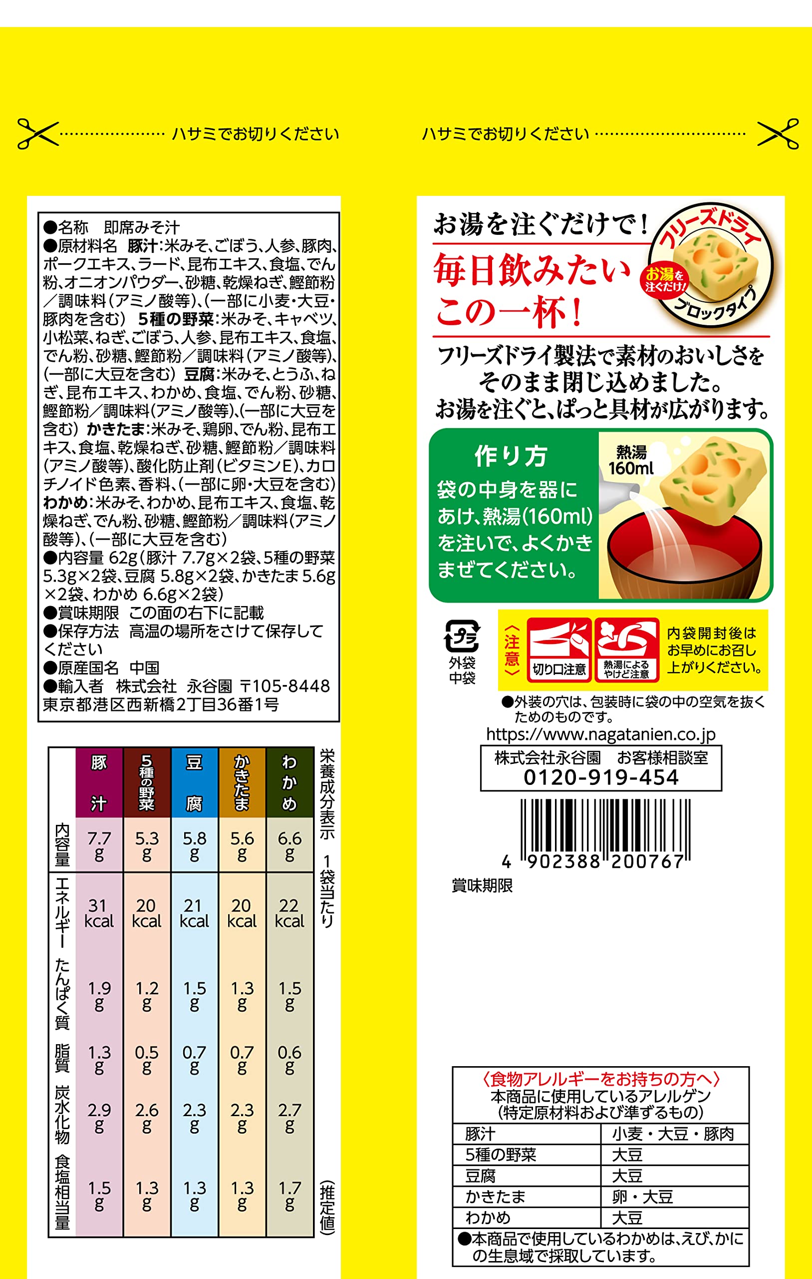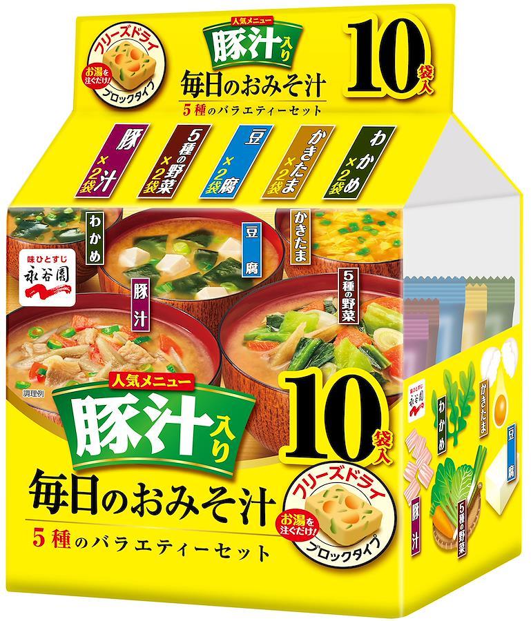 フリーズドライブロックタイプの徳用みそ汁です。お湯を注ぐだけで手作りのような味わいが楽しめます。人気の5メニュー、豚汁、5種の野菜、豆腐、かきたま、わかめ各2袋入り。