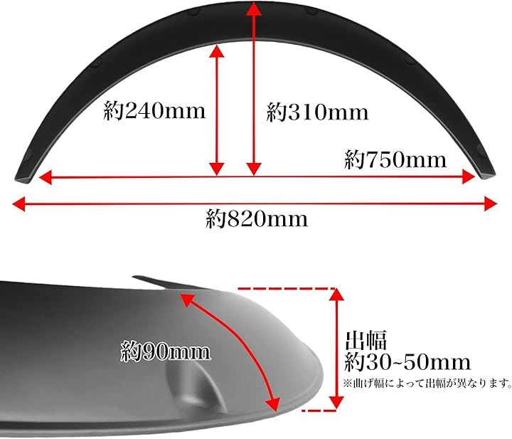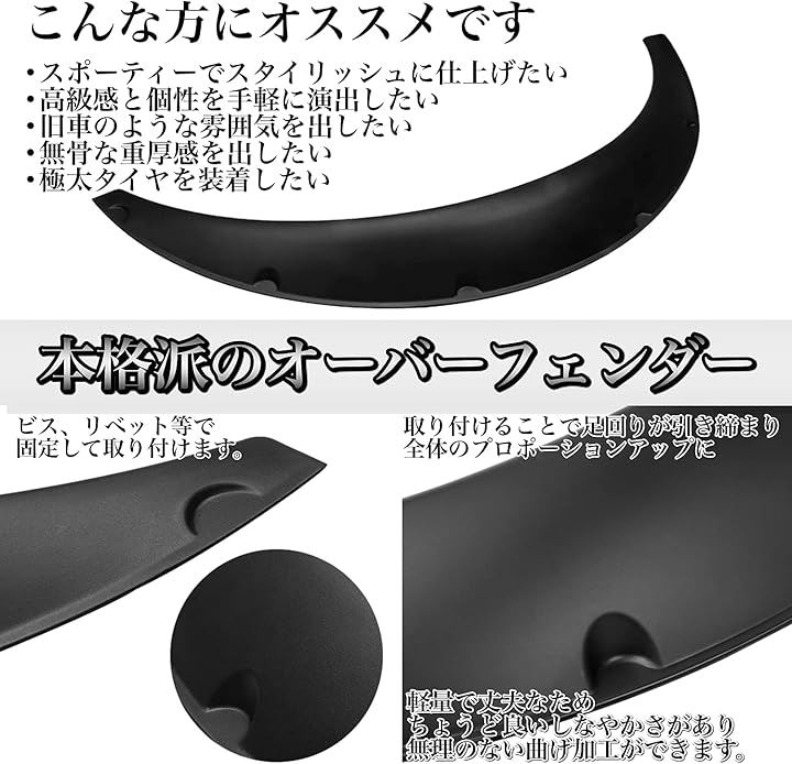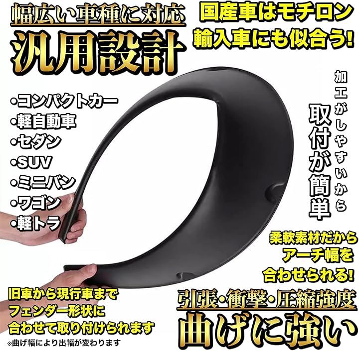 「アーチラインで合わせれる柔軟素材」 曲げに強いので加工がしやすいので取付が簡単です。車種ごとに異なるアーチラインに合わせれるのでサイズが合えば、軽自動車からコンパクトー・セダン・ミニバン・クーペ・ワンボックスなどいろいろな車種に対応します。