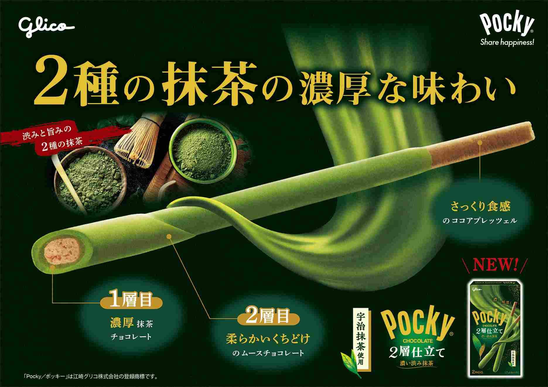 ふんわりムースで、優しく包むポッキーです。・2種の抹茶をたっぷりと使用し、渋みと旨みを感じる奥深い味わいです。・外側にまとわせたエアレーションチョコレートにより、抹茶の奥深く濃厚な味わいを柔らかいくちどけで楽しめるポッキーです。・ふんわり軽いくちどけのチョコレートなので、後くちがよく、日中の合間の休憩時間にも友人同士で気軽に分け合うことができます。