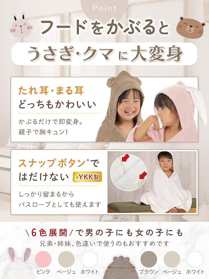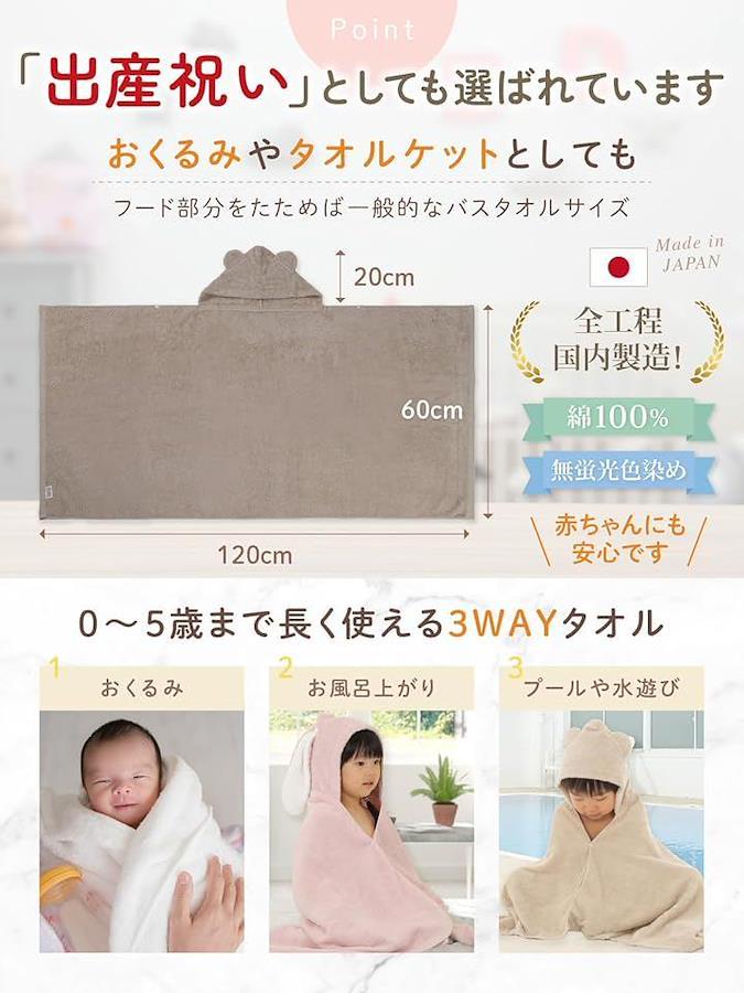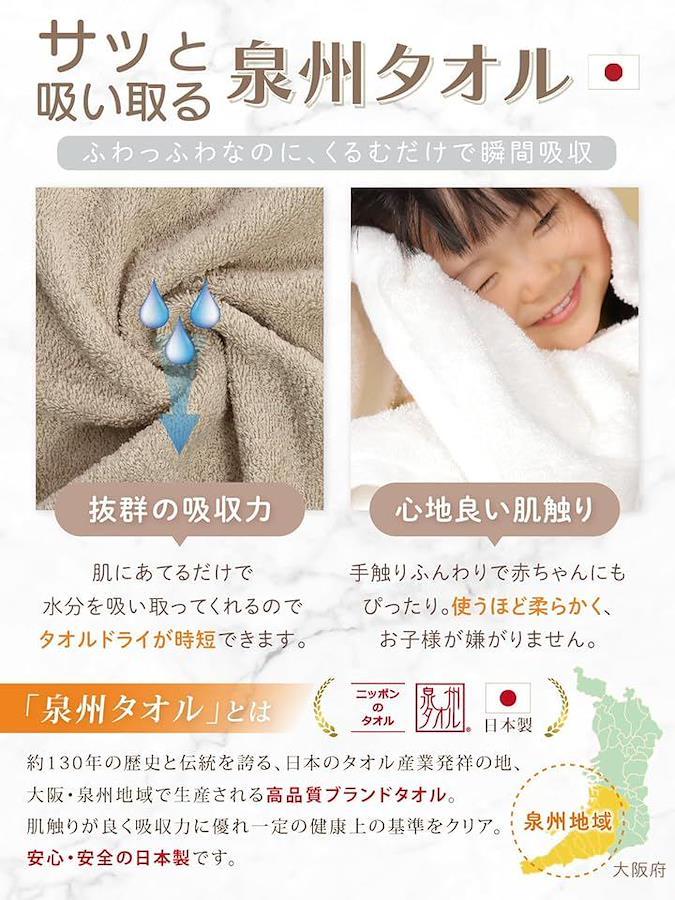 「赤ちゃんとママに優しい贈り物」100年以上の歴史を誇る大阪・泉州タオルから生まれた日本製のベビーバスローブで、赤ちゃんの柔らかな肌をふんわり包み、入浴後も心地よい温もりをキープします。