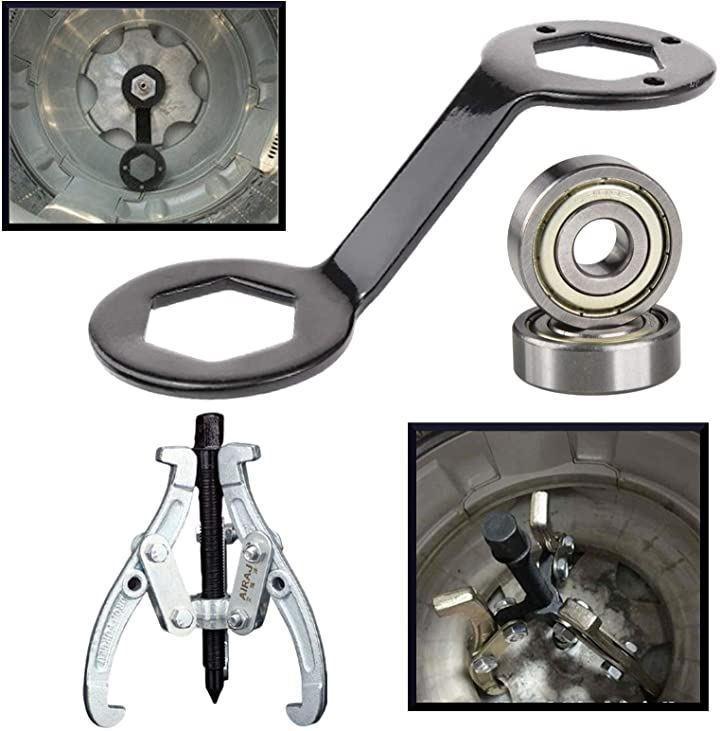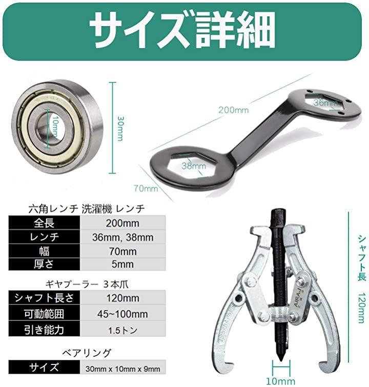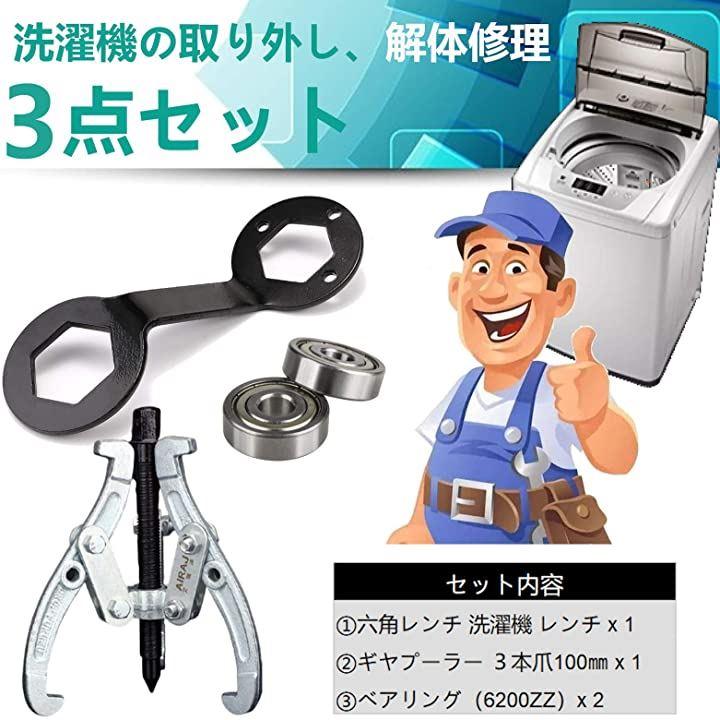 ・洗濯機メンテンナンスにお使いいただける、めがねレンチとギヤプーラー3本ツメとベアリング2個のセットです。