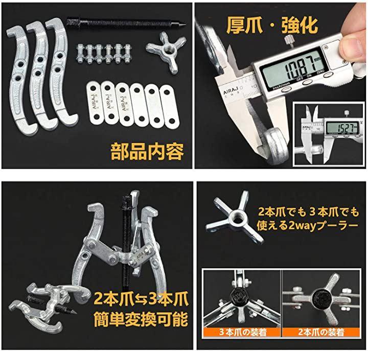 ・洗濯機を分解洗浄・ドラム・オーバーホール・だけでなく、ハブベアリングの抜き取り・ベアリングや歯車の脱着・交換などに、3本爪ですので2本爪より安定感がありますが、狭いところに使用が出来ない場合があります。