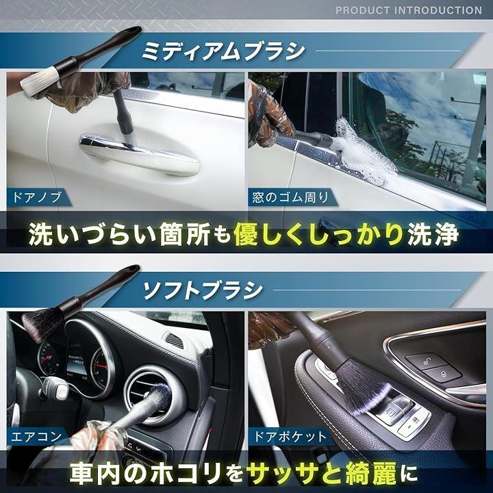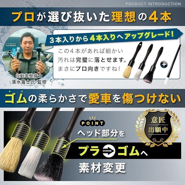 [4種類のディテールブラシセット]4種のブラシで、スポンジでは落としきれないホイールやエンブレムなどの細かいを徹底的に落とす大満足の洗車セットです。
