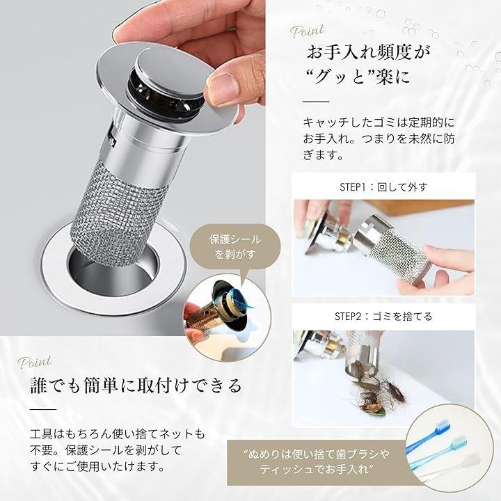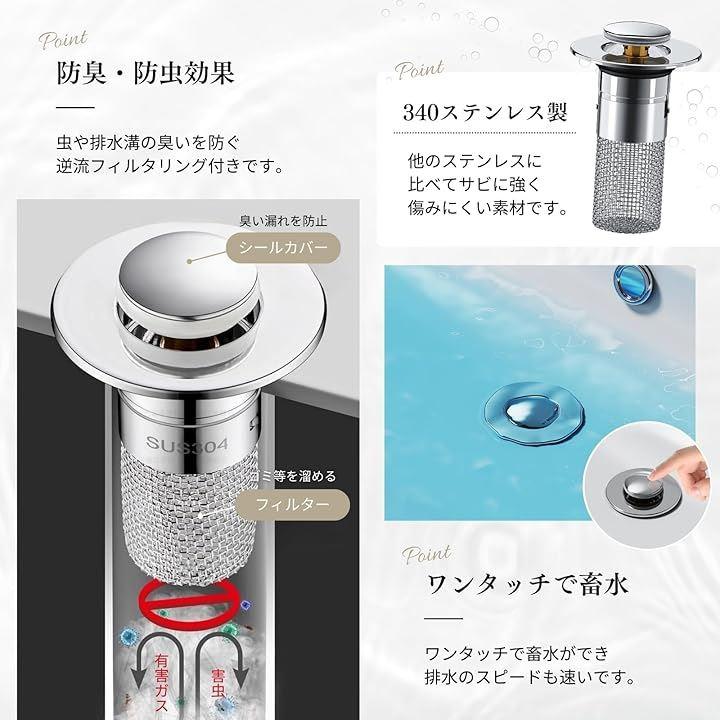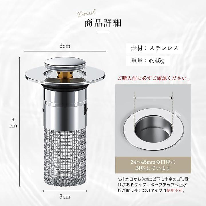 「幅広い対応サイズ」34~45mmの排水口に対応し、各種ゴムパッキンを付属。