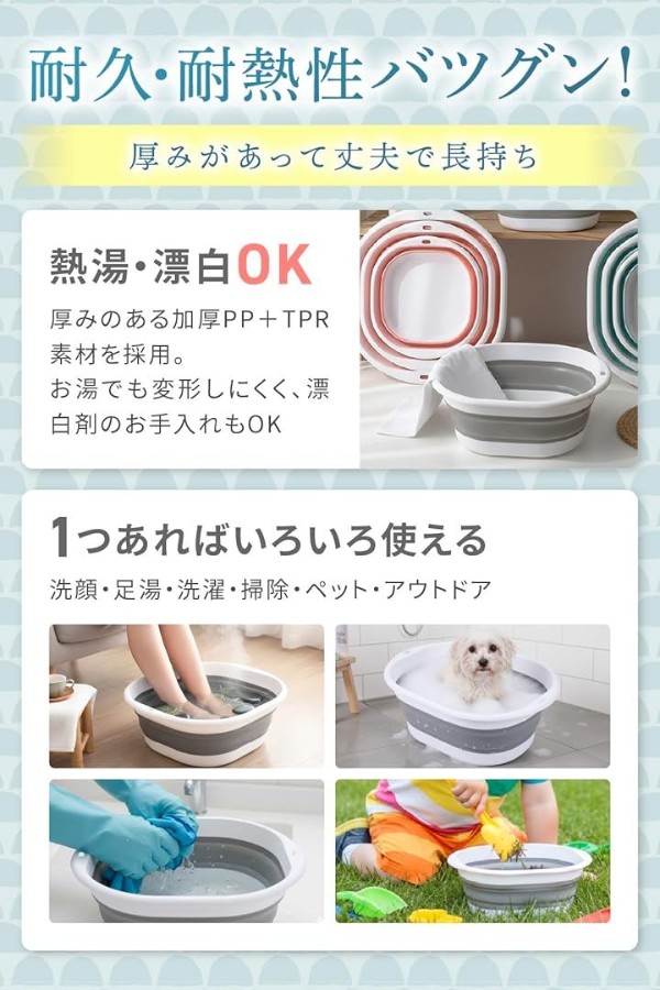 「足湯・足湯バケツとしても活躍」 しっかりした深さと安定感があり、足湯や足湯バケツとしても使用可能。