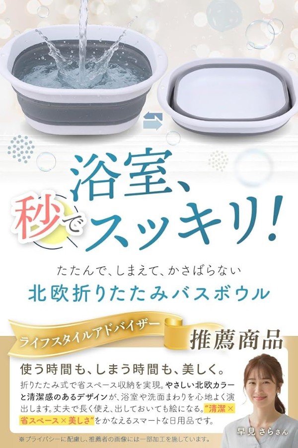 折りたたみ洗面器としても使え、棚や洗面台下にスッと収納可能。
