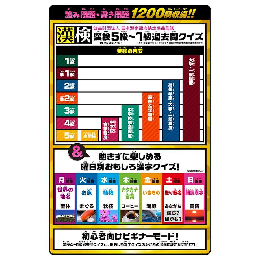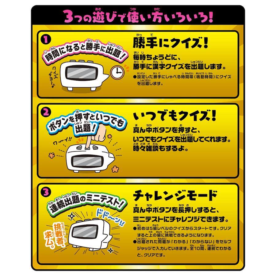 漢字クイズとおしゃべりで毎日を盛り上げる愛嬌たっぷりの漢字クイズナビゲーター。時間になったら勝手に出題。ふとした瞬間ついついやっちゃう!(声:沢城みゆき)●時間になったら勝手に出題正解も勝手に表示毎時間、音声と液晶画面で漢字クイズを出題。楽しいおしゃべりでも毎日を盛り上げてくれます(声:沢城みゆき)●読み書き問題1200問収録日本漢字能力検定協会監修の漢検5級~1級の過去問クイズや、曜日ごとにテーマが変わるおもしろ漢字クイズで飽きずに楽しめる。「難しい問題はちょっと」という方にはビギナーモードでお楽しみ頂けます!●3つの遊び方で使い方いろいろ(1)時間になったら勝手に出題(2)ボタンを押すといつでも出題(3)漢検過去問クイズのミニテスト【セット内容】本体(1),説明書(1),紙製看板プレート(1),