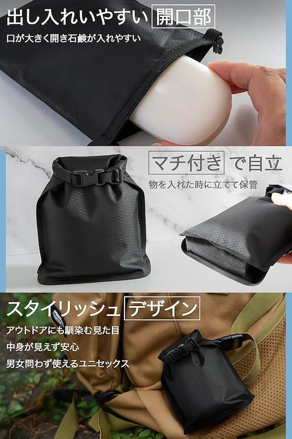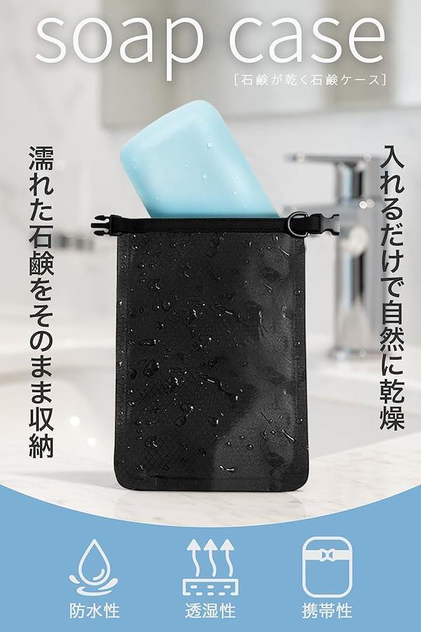 「水漏れを防ぐ防水構造でバッグの中も安心」内部の防水フィルムが水分の浸み出しを防ぎ、濡れたまま石鹸を入れても周囲の荷物を濡らしません。